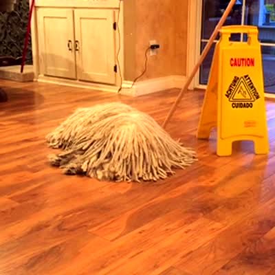 A dog that looks like a mop sits beside a "Caution Wet Floor" sign before a knock is heard at the door and the dog gets up and walks away.