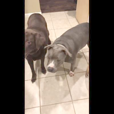 A dog barks at a TV showing AFV. An adult woman filming asks the dog if it's because the show isn't playing more dog videos, then adds that she'll send in a complaint.