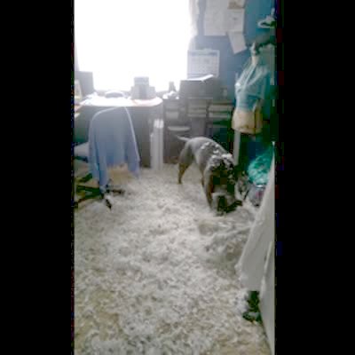 A dog walks around a room full of feathers. A woman yells "What he doing" when she sees the mess. The dog then shakes out the pillow he destroyed and more feathers fly into the air. A man curses and then the man and women in unison yell "Mason!".