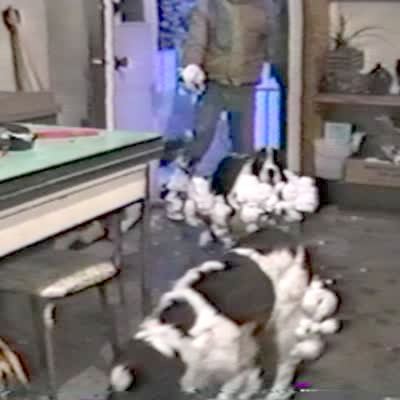 Dogs have huge balls of snow on their ears & body. (added outdoor shots)