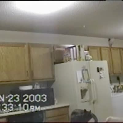 A black cat chases a moth indoors as it flies around a lamp hanging over a kitchen sink. The cat jumps for the moth repeatedly before he incidentally pulls the cord to the lamp and turns the light out.