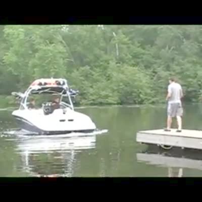 Tot boys on giant inner tube being pulled by motor boat. Tube hits a wave and one of the boys goes flying out, 10 feet in the air.