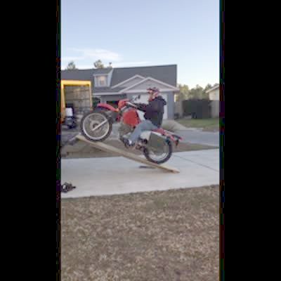Man jumps on his motorized dirtbike in the backyard, bike bursts into flames, man's pants catch on fire. Clip has many cuts and edits. Bonehead.