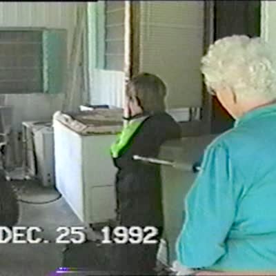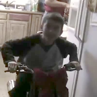 Boy rides new motorbike inside the house on Christmas. He crashes off-camera. Cuts to kitchen table turned on its side.