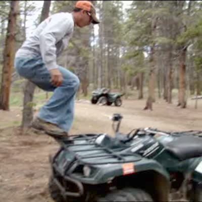 Teen boy tries to pop a wheelie on an ATV but he gets thrown over the handlebars when he hits the brake. 4 wheeler, motorbike. Good recovery.