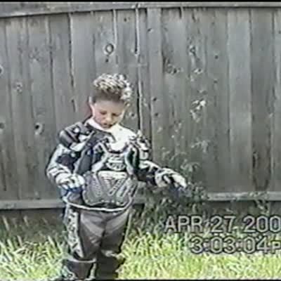 A young boy drives on a motorcycle in a yard while his dog runs behind him. Then the boy hits a jump and flies over the handlebars, falling to the ground. Music rights not cleared.