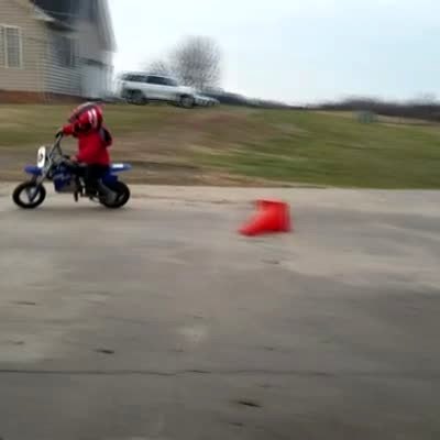 A tot boy drives a motorbike in the yard. He crashes into something out of frame and says "I'm okay."