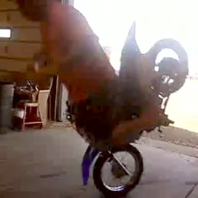 Security footage of a teen boy that rides motorcycle into garage and hits face on garage door and falls off to ground. inappropriate language