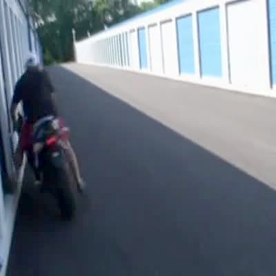 Man rides motorcycle into the side of a storage unit and crashes. Bonehead.