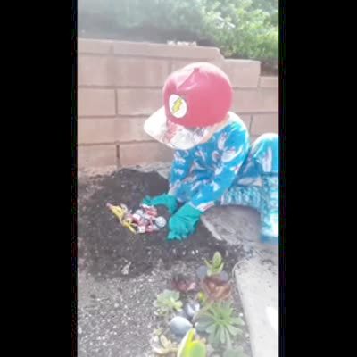 A tot boy buries two toy motorcycles in his grandmother's garden while he tells her it's so they'll grow big enough for him to ride.