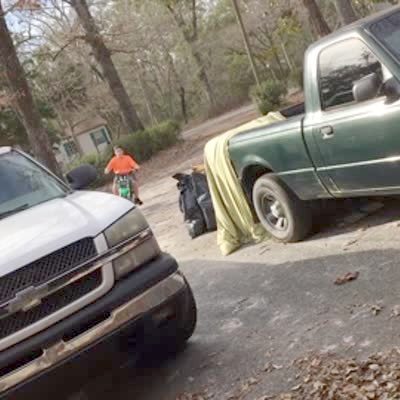 A man loses control while he drives a motorcycle tricycle in the driveway and pops a wheelie and crashes into a parked truck.