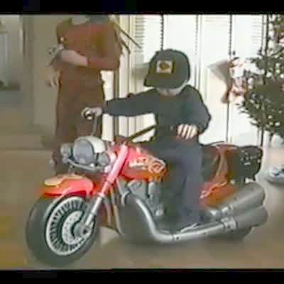 Tot boy gets toy motorcycle for Christmas, drives it backwards into Christmas tree