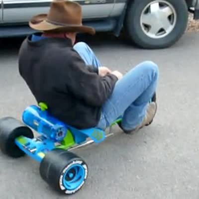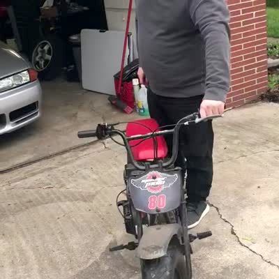 Man rides a child's toy motorcycle in the driveway, the wheels fall off because he's too heavy for it.
