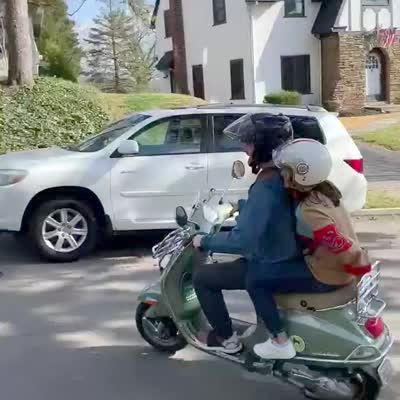 A woman rides a motor bike on the driveway straight into a parked car.