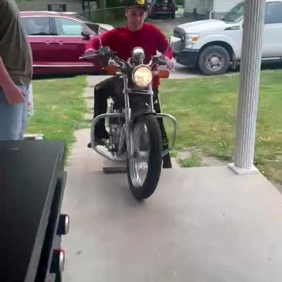 A man drives a motorcycle up a plank onto the front-porch but he falls into a pillar and the pillar breaks.