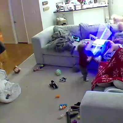 A man lies on the couch in the living room and a tot boy holds a toy lightsaber. The boy smacks the man hard in the groin with the lightsaber and the man falls off the couch. Security footage.