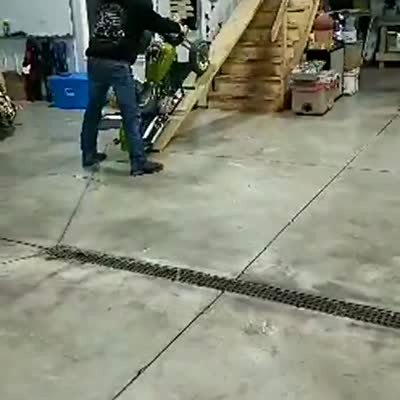 A motorcycle flips over and crushes a man when he slams on the brakes in the garage. Another man laughs at him as he sits with a broken leg.