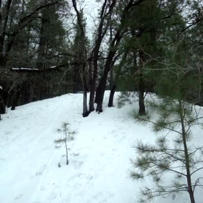A yellow Labrador jumps over a large pile of winter snow to chase a frisbee, and the dog flips on the landing. Slow motion.