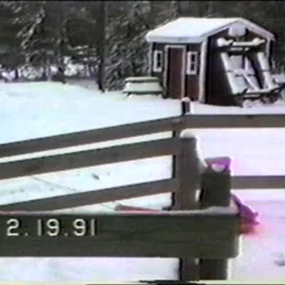 Girl & boy play in the snow. Girl throws a snowball at the house & a big mound of snow hits her in the face, she laughs. Winter.
