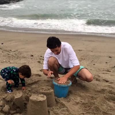A man makes a sand castle with his tot son on a beach. The tot boy leans on one of the mounds of sand and falls through it.
