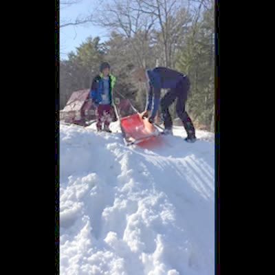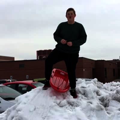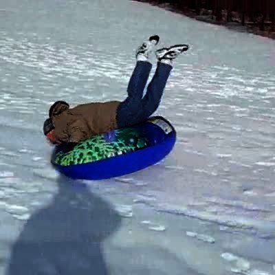 2 teen boys sled quickly down snow hill & hit a mound, they fly into the air and fall off the boat raft they're using as a sled.