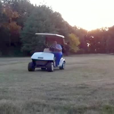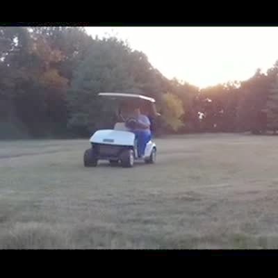 Teen boy drives golf cart over mound on golf course, crashes and falls out of cart. Bonehead.