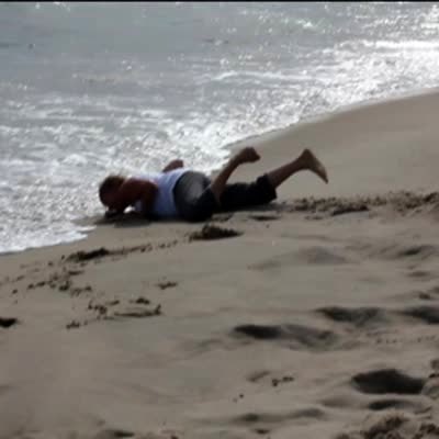 Woman races teen boy & girl on the beach while running, she trips on a sand mound and falls face first into the ocean. water.