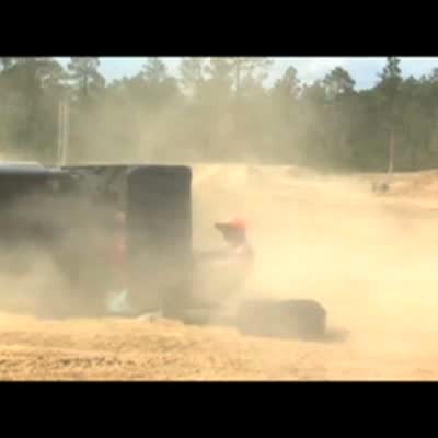 2 men drive a golf cart over a dirt mound too fast. The cart flips onto its side and crashes. Men are ok. Boneheads.