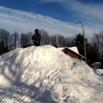 A woman stands under a large amount of snow hanging over a roof and hits it with her shovel. The snow collapses on top of her.