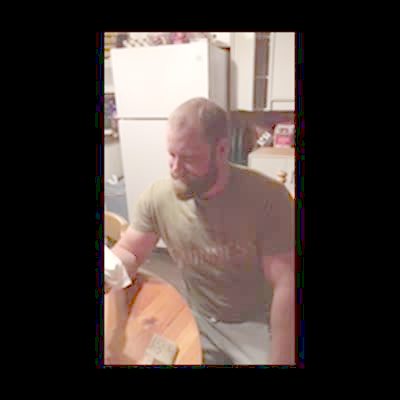 A man traps a mouse in a bucket in his home indoors and holds it up for his wife behind the camera to see when it jumps out of the bucket and everyone screams.