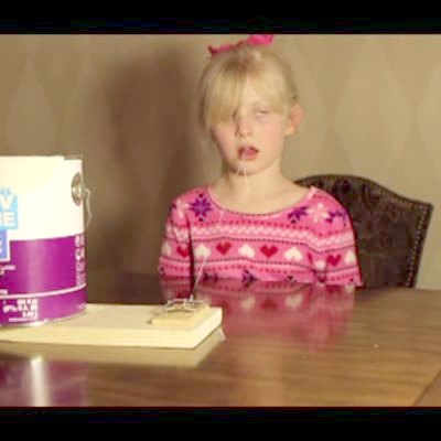 A young boy sets off a domino chain of VHS tapes and DVD cases that fall through the house and down the stairs, then the cases hit a mouse trap and launch a toy soldier into a cup. Multiple clips edited together.