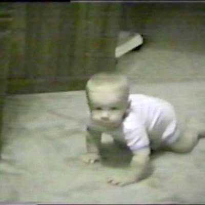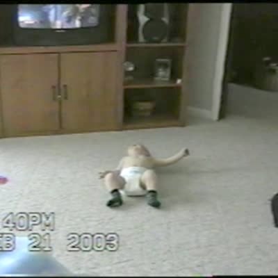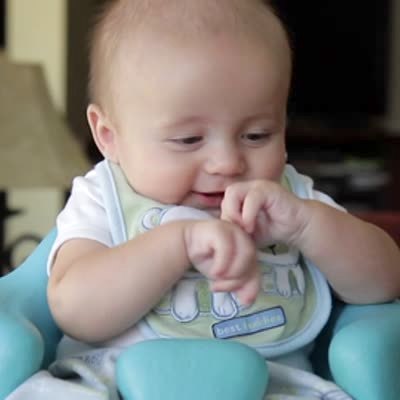 A baby boy sits in a baby chair and wiggles his ears at his mother's command. (dad is actually behind him doing it.)