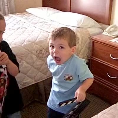Tot boy & girl use movie clap boards and say "Action." Tot boy closes it on his finger.