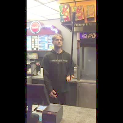 A teen boy pulls down his father's pants at a movie theater as he buys snacks.