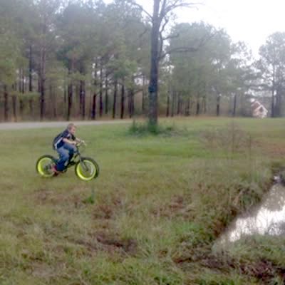 A boy rides a bike into a mud hole outdoors and crashes into the water.