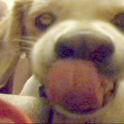 "Mugging Mutt" A woman films her dog's poop on the carpet, then turns to her dog to scold him and he bares his teeth in a smile.