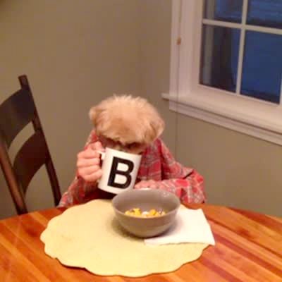 A dog with human hands eats cereal and drinks from a mug.