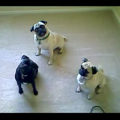 "Mugging Pugs" 3 black & white pug dogs turns their heads from side to side as owner talks to them. Funny visual.