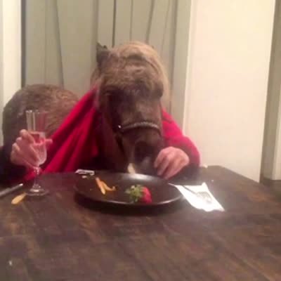 A horse sits at a dinner table and eats. A man underneath the table pretends his arms belong to the horse. The horse then knocks over a glass.