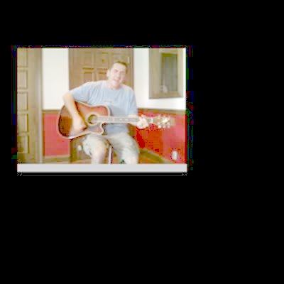 Man sits in a deck chair and plays guitar and sings with teen boy. The chair suddenly breaks, he falls over.