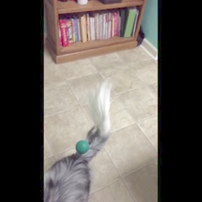 Fluffy, hairy gray dog barks & bounces in front of his bone on the floor. Dog looks like it's head banging.