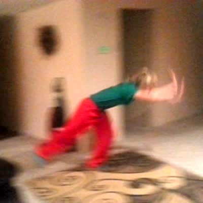 A young boy attempts to ride a mechanical bull but falls off then gets nailed into by the bull, as he flies out of frame.