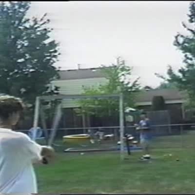 Man hammers nails into the side of above ground pool until it bursts open and water pushes the man to the ground. Bonehead.