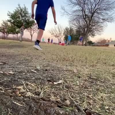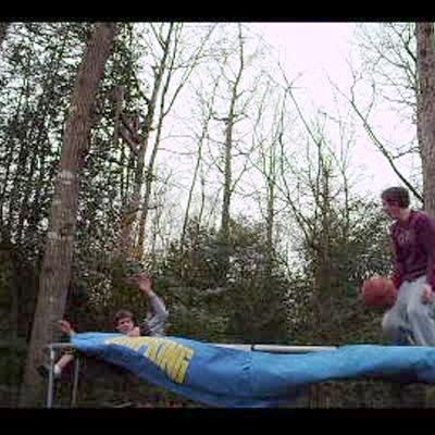 Kids jump on trampoline with giant snowball - which nails one kid in crotch; groin