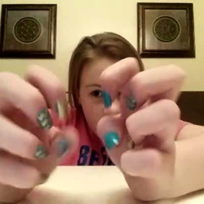 A young girl talks to the camera and films herself as she taps a plastic bottle with acrylic nails. Her man grandpa walks into the room and screams and scares her and she flinches. Two videos put together.