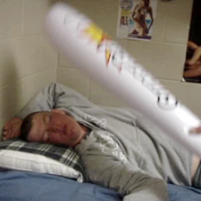 "Sleepy Sandal Slapper" A young man sleeps deeply on a couch and his friend decides to see what crazy things he can do without waking up his friend. He slaps his friend in the face with a flip flop. He pours cake flour on him and then starts hitting him in the face with the flip flop again. He sprays a kind of febreeze in his face and slaps him some more and he finally wakes up.