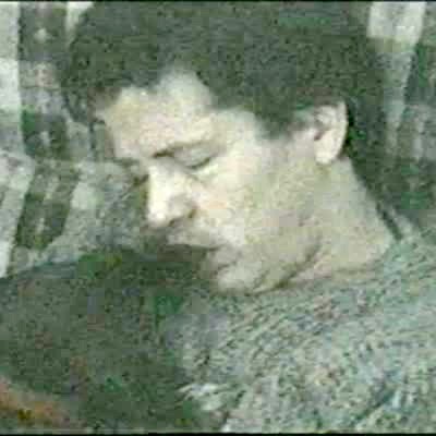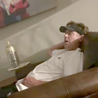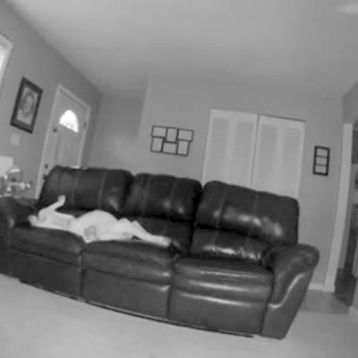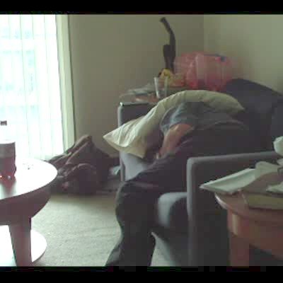 A man sleeps in a chair in his house. When an alarm goes off he wakes up and screams while a woman offscreen laughs.