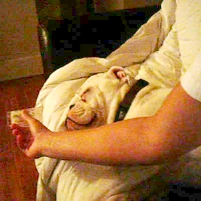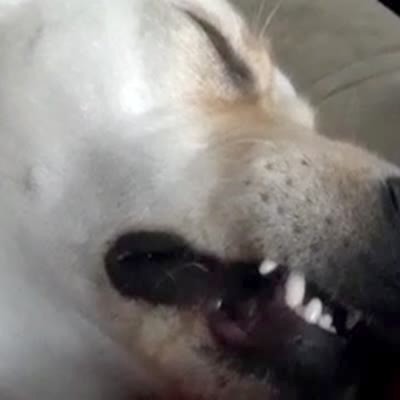 A dog sleeps and shows her teeth, having some sort of dream, amusing the woman behind the camera.