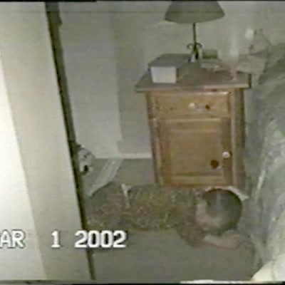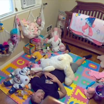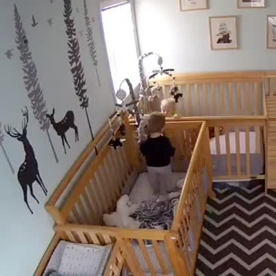A woman takes a baby into its crib. She lowers him to the mattress, but leans too far, and falls into the mattress herself. She then pushes herself out of the crib. Security camera footage.