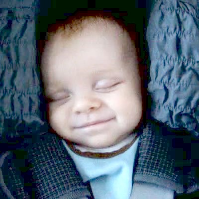 Baby boy in a blue shirt smiles while taking a nap in his car seat. Cute.